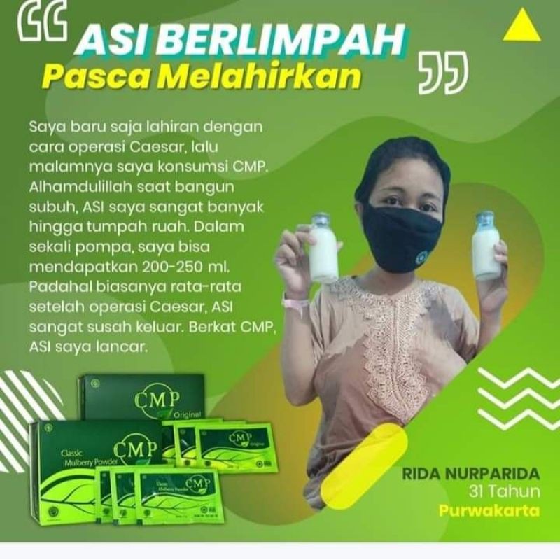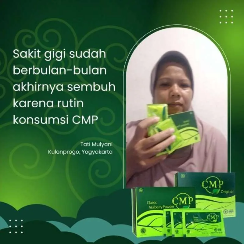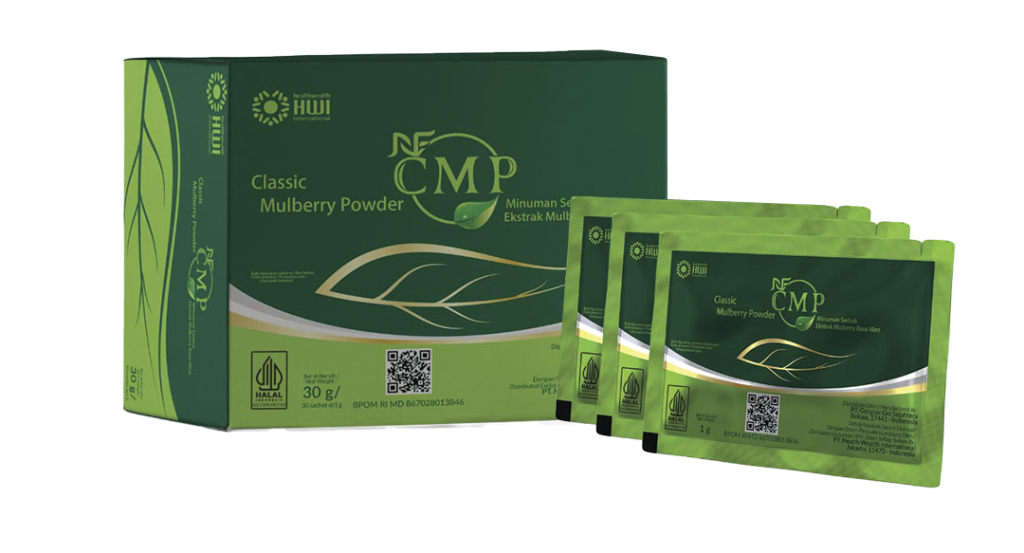 CMP (Chlorophyll Mint Powder) adalah minuman serbuk herbal yang mengandung klorofil sebagai bahan utama, diekstrak dari daun Mulberry (Morus Alba), dikombinasikan dengan rasa mint yang menyegarkan.