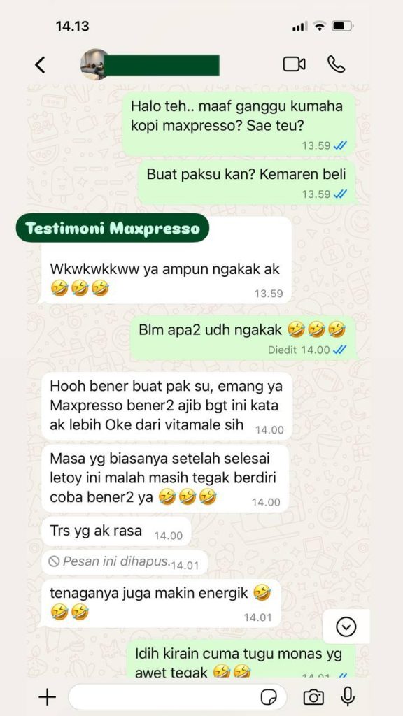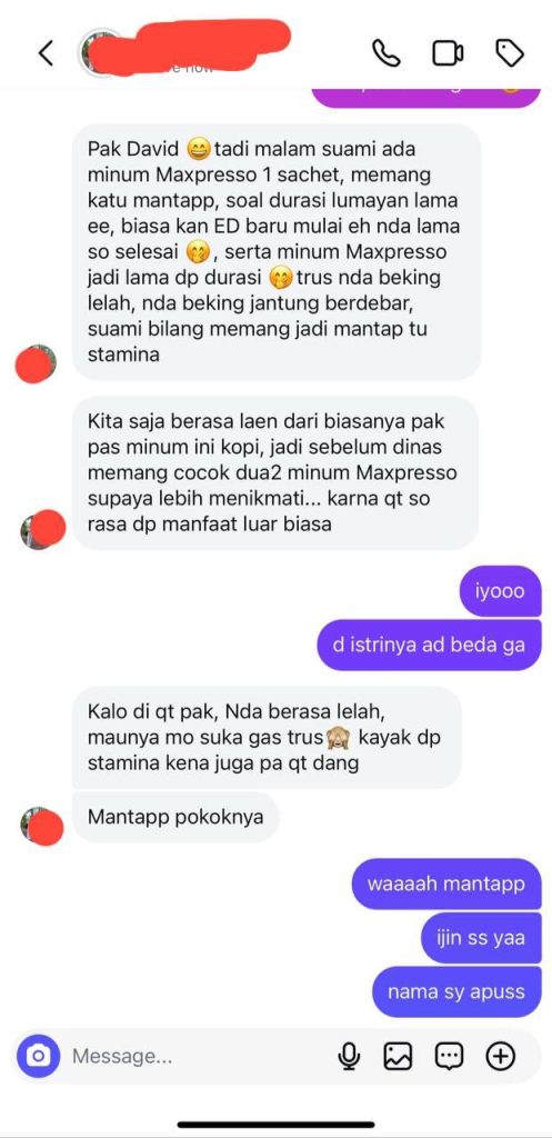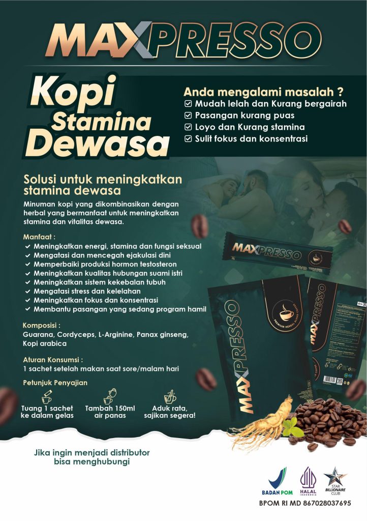 Kandungan dalam Kopi Maxpresso sudah teruji secara ilmiah dapat membantu performa seksual pria. Kandungan dalam Kopi Maxpresso seperti ARABICA, GINSENG, GUARANA, CORDYCEP DAN L-ARGINIE.